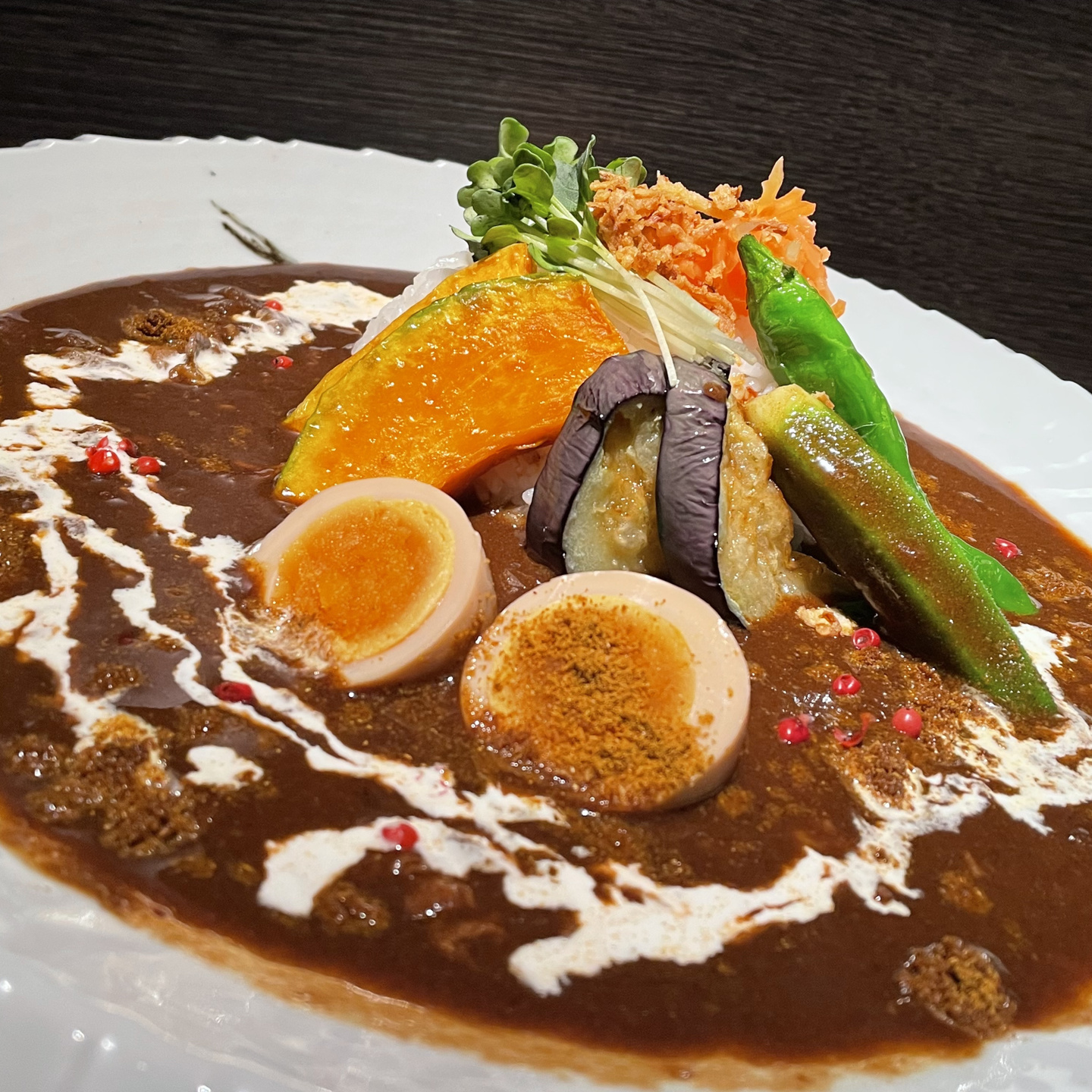 こだわりの自家製ルーに季節の素揚げ野菜と味付け玉子をトッピングしており一緒にお召し上がり頂くことで食べ飽きしない仕上がりとなっております。